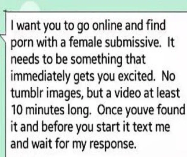 DOM: Es vēlos, lai jūs apmeklētu tiešsaistē un atrastu pornogrāfiju ar sievietēm pakļāvīgu. Tam jābūt kaut kam, kas nekavējoties jūs satrauc. Nav Tumblr attēlu, bet vismaz 10 minūtes garš video. Kad esat to atradis, un pirms sākat to sūtīt man īsziņu un gaidiet manu atbildi.